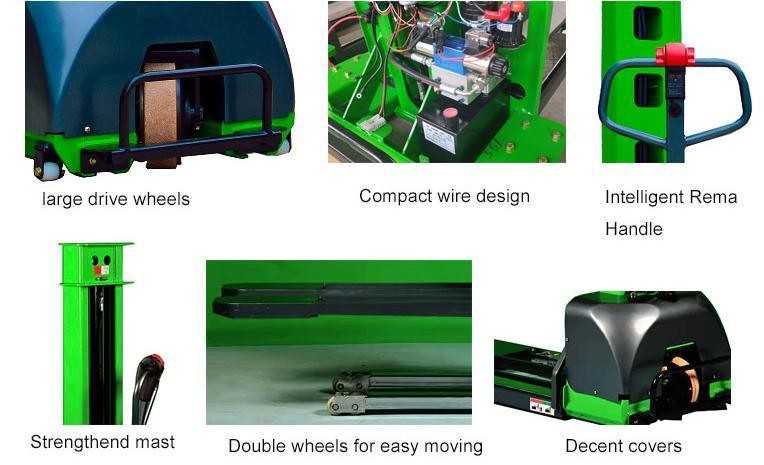 Zweitens handelt es sich um einen halbelektrischen Stapler, der auch manuelle Kraft benötigt, um zu ziehen und zu schieben.